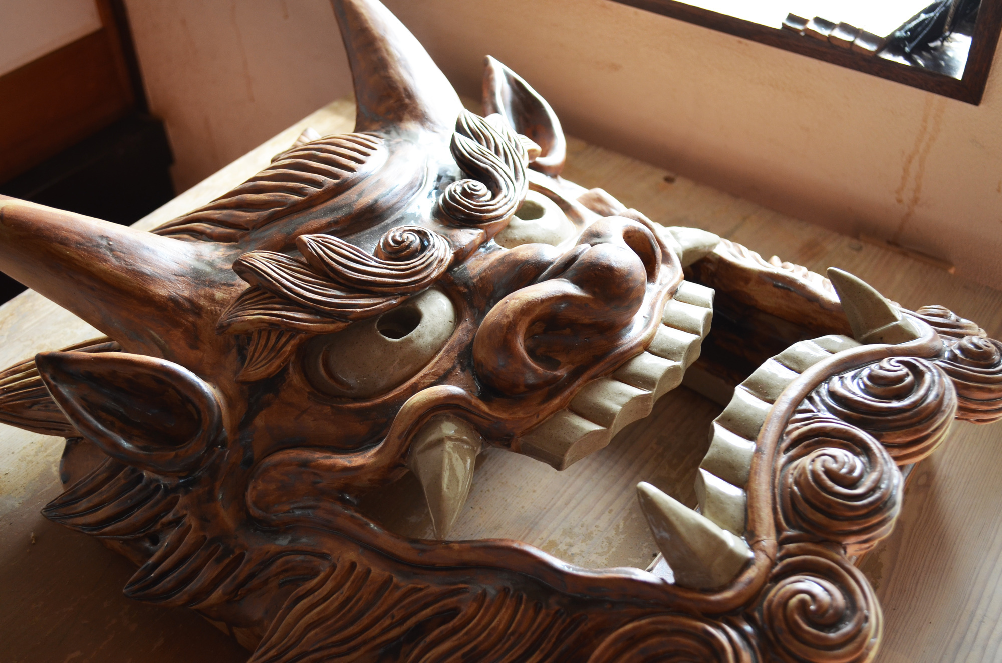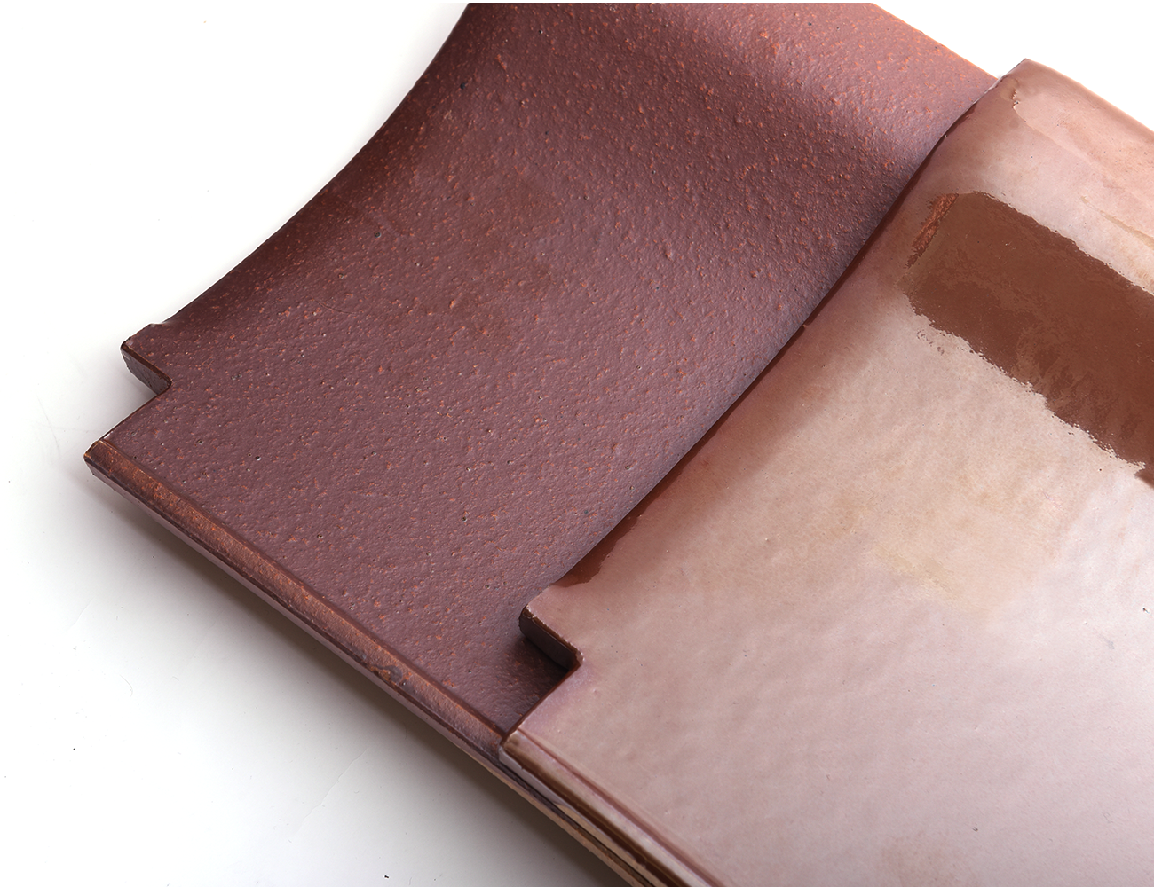 本来待瓦は水5割に対し来待石を粉砕したモノ5割で調合し施釉するところ、サビ瓦は水8割に対して来待石2割の釉薬を施釉いたします。仕上がり具合は淡い赤褐色。