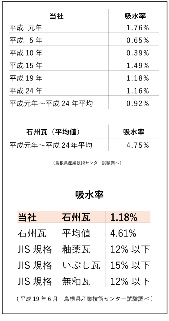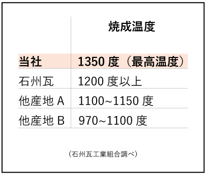 焼物の「気孔」に水分が浸入し、その水分が凍って膨張します。その体積の変化が瓦の組織をボロボロに壊していきます。焼物は高温で焼けば焼くほど「気孔」が小さくなり水分を含み難くなります。当社は超高温1350度で焼き締めることにより、水分の浸入を防ぎます。