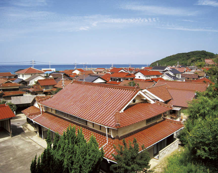 石州の青い海辺にたたずむ小さな漁村の赤い屋根、
